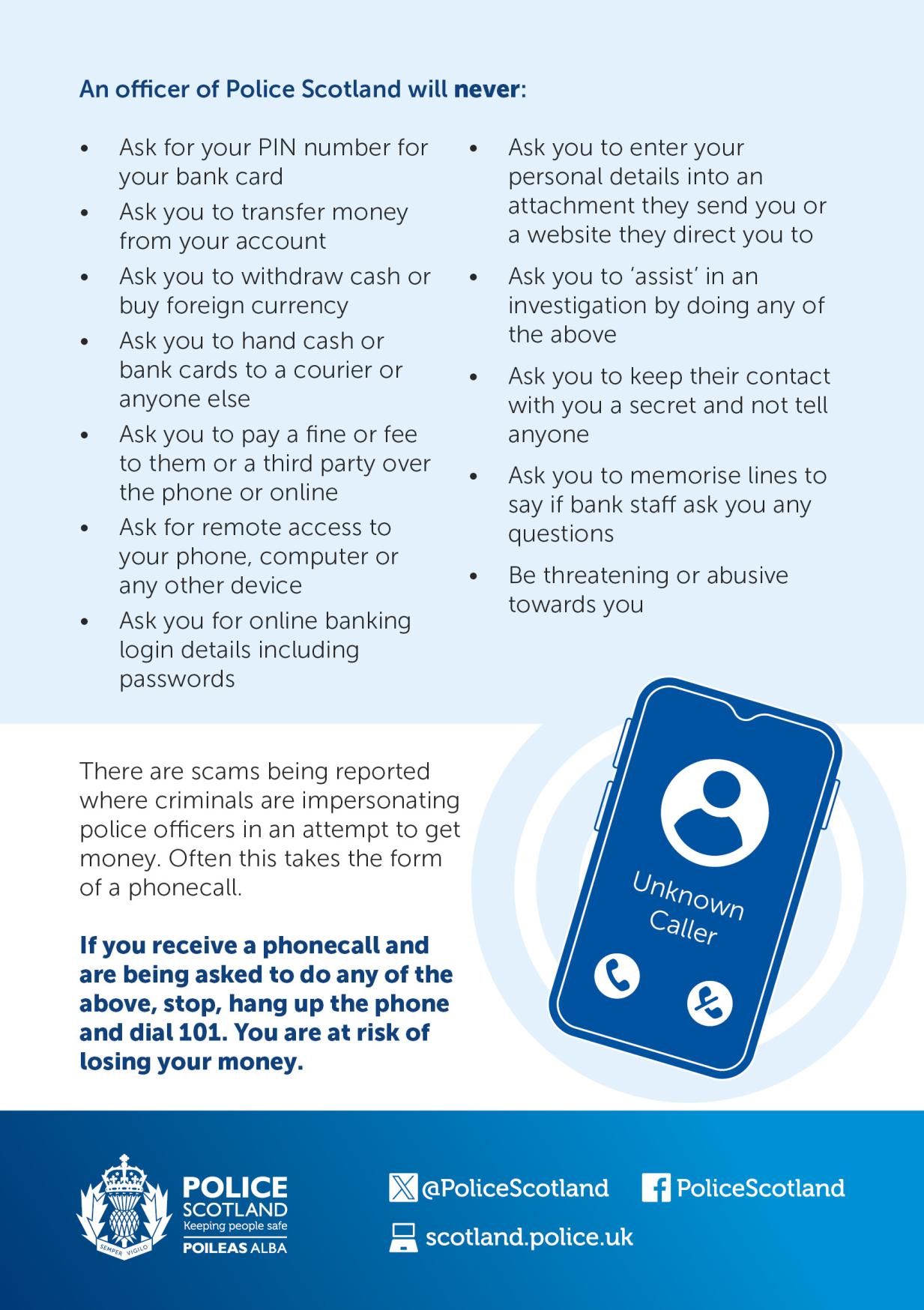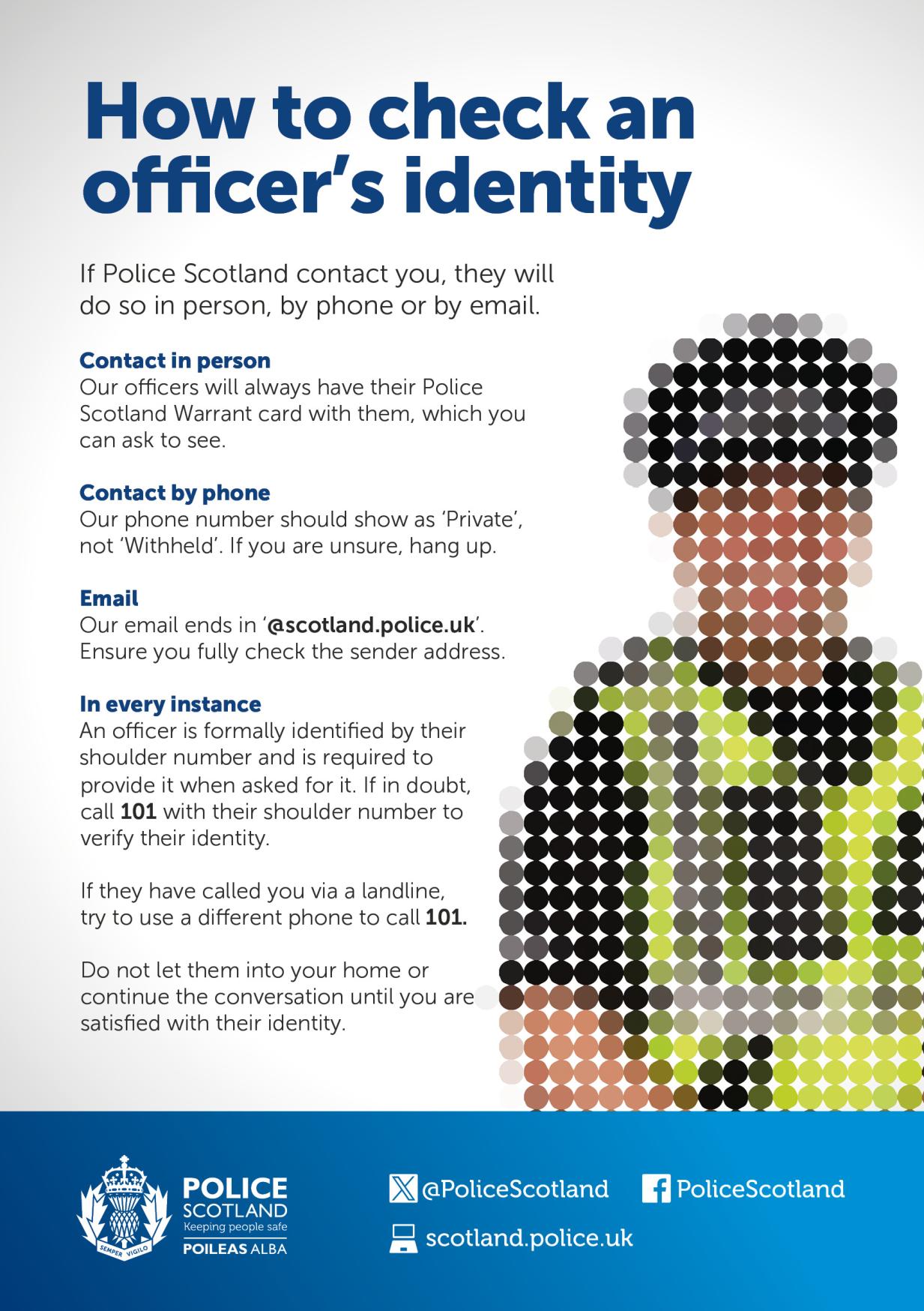 With there being so many scams out there, Police Scotland have provided information on the ways their officers contact people, how they will identify themselves, but more importantly, how you can check they are who they say they are. Genuine Police Officers will not mind you wanting to verify their identification, particularly if they are looking to enter your home. Be scam aware, and it's better to be safe than sorry.